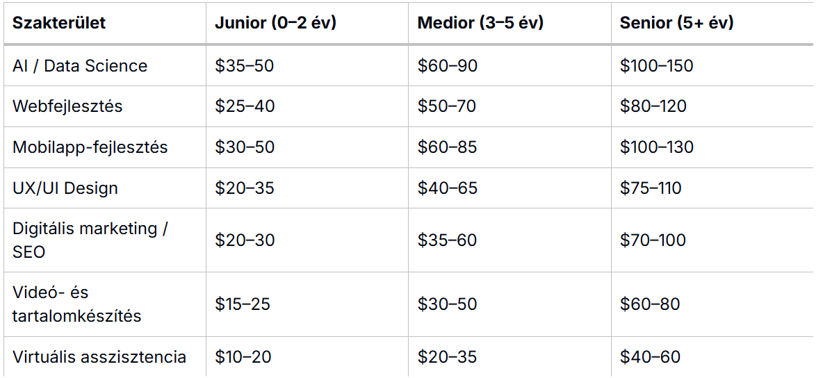 Trend: az AI-integráció miatt a „kreatív, de nem stratégiai” feladatok díjai stagnálnak vagy csökkennek, míg az összetett, stratégiai gondolkodást és emberi intelligenciát igénylő munkák óradíjai emelkednek.